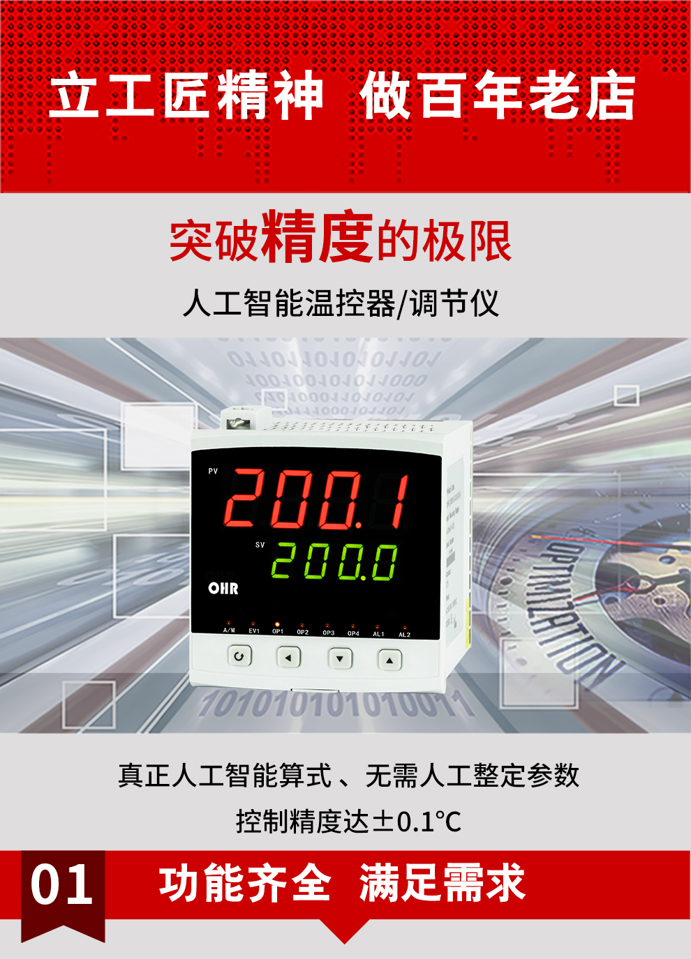 OHR-E300系列人工智能調(diào)節(jié)儀采用真正的人工智能算式,儀表啟動自整定功能,可以根據(jù)被控對象的特性,自動尋找參數(shù)以達(dá)到很好的控制效果,無需人工整定參數(shù)??販鼐然具_(dá)±0.1℃,無超調(diào)、欠調(diào),達(dá)國際先進(jìn)水平。