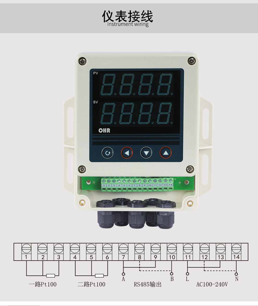 OHR-XTRT系列溫度遠(yuǎn)傳監(jiān)測儀采用了表面貼裝工藝,全自動貼片機(jī)生產(chǎn),具有很強(qiáng)的抗干擾能力。本儀表支持兩路PT100輸入,實現(xiàn)對溫度物理的測量顯示,帶RS485通訊輸出功能,帶雙屏數(shù)碼管顯示,上窗口顯示第1路測量值,下窗口顯示第2路測量值。