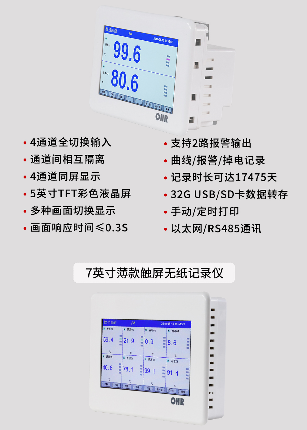OHR-T系列觸摸超薄無紙記錄儀采用新型大規(guī)模集成電路,對(duì)輸入、輸出、電源、信號(hào)采取可靠保護(hù)和強(qiáng)抗干擾設(shè)計(jì)。8路萬能信號(hào)輸入(可組態(tài)選擇輸入:標(biāo)準(zhǔn)電壓、標(biāo)準(zhǔn)電流、熱電偶、熱電阻、頻率、毫伏等)??蓭?路報(bào)警輸出,1個(gè)饋電輸出,RS485通訊接口,以太網(wǎng)接口,微型打印機(jī)接口和USB接口,SD卡插座。