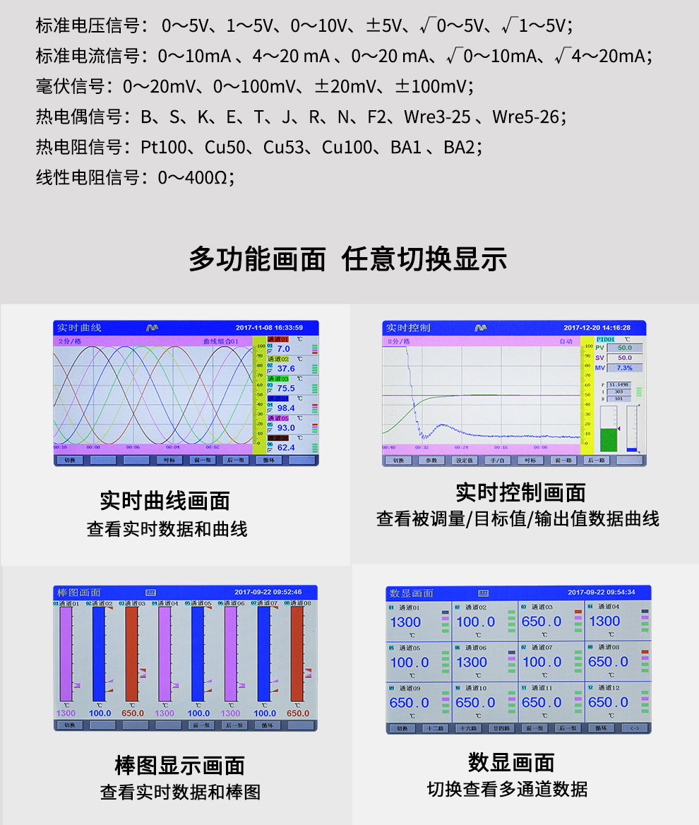 OHR-H300系列彩色調(diào)節(jié)無紙記錄儀采用真正的人工智能算式,儀表啟動(dòng)自整定功能,可根據(jù)被控對(duì)象的特性,自動(dòng)尋找最優(yōu)參數(shù)以達(dá)到很好的控制效果,無需人工整定參數(shù)。控溫精度基本達(dá)±0.1℃,無超調(diào)、欠調(diào),達(dá)國(guó)際先進(jìn)水平。24路萬能輸入(可組態(tài)選擇輸入:標(biāo)準(zhǔn)電壓、標(biāo)準(zhǔn)電流、熱電偶、熱電阻、毫伏等)其中可帶8路控制輸入。