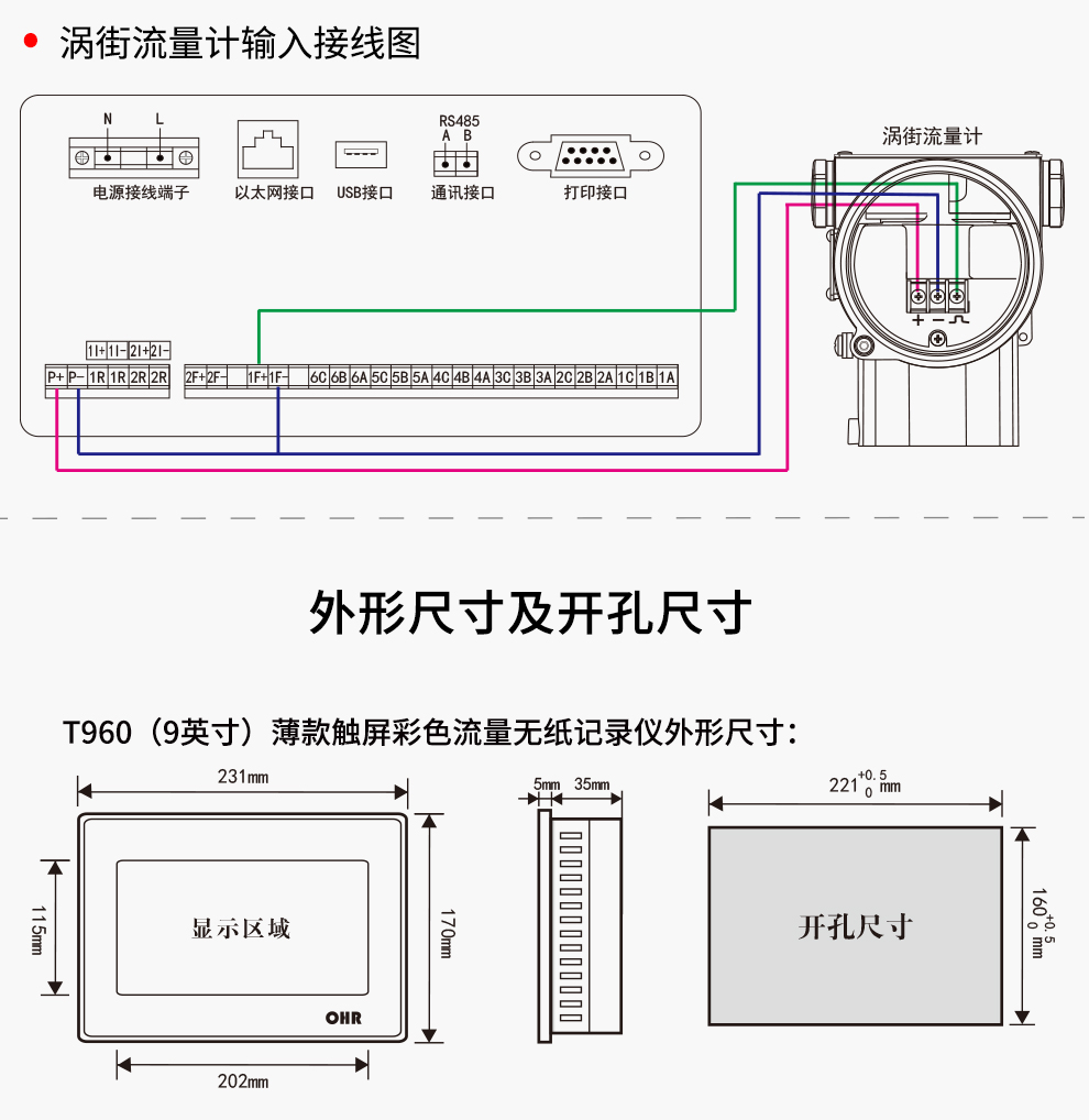OHR-T系列觸摸超薄流量無(wú)紙記錄儀采用新型大規(guī)模集成電路,對(duì)輸入、輸出、電 源、信號(hào)采取可靠保護(hù)和強(qiáng)抗干擾設(shè)計(jì)。6路萬(wàn)能輸入(可組態(tài)選擇輸入:標(biāo)準(zhǔn)電壓、 標(biāo)準(zhǔn)電流、熱電偶、熱電阻、頻率、毫伏等)其中可帶2路流量輸入。具有繼電器報(bào)警 輸出、變送輸出,饋電輸出,流量積算,溫壓補(bǔ)償功能。