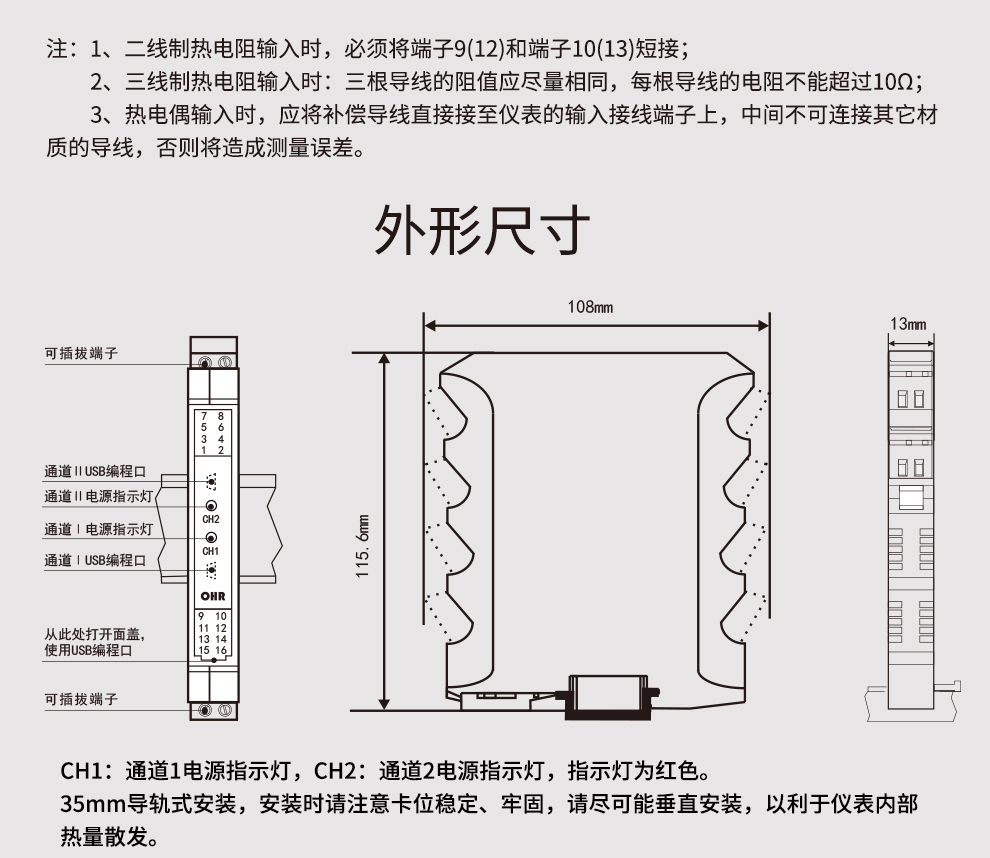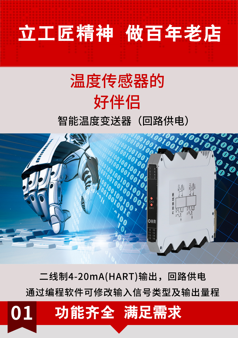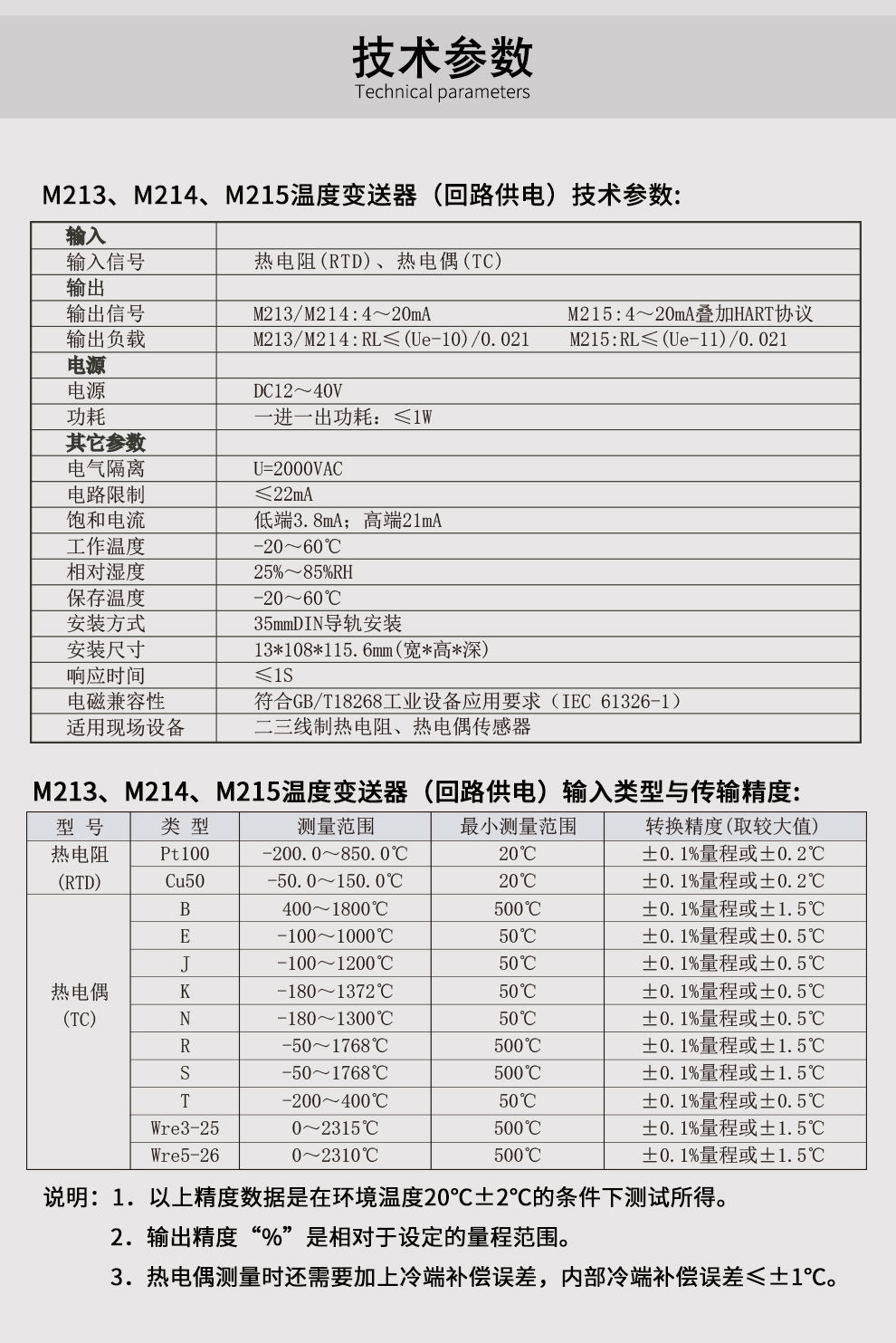 回路供電溫度變送器分為M213智能溫度變送器、M214隔離智能溫度變送器、M215 HART智能溫度變送器,變送器將現場的熱電阻或熱電偶信號經過隔離放大處理,轉換為與溫度成線性的二線制4-20mA(HART)信號輸出至控制系統(tǒng)。