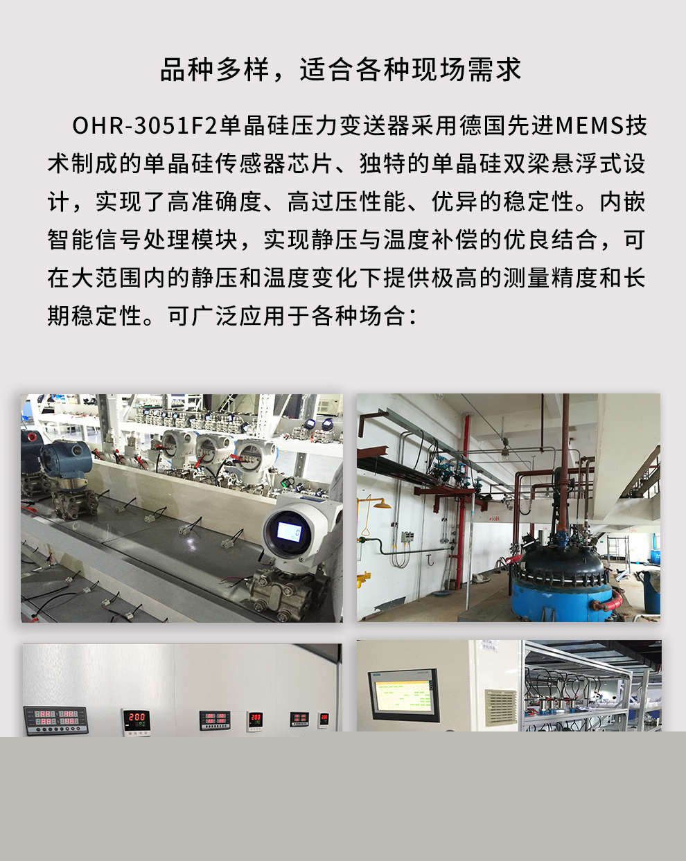 OHR-3051F2智能單晶硅直裝壓力變送器能準(zhǔn)確的測量壓力,并把它轉(zhuǎn)換成4~20mADC的輸出信號。該變送器可通過三按鍵本地操作,或通用手操器、組態(tài)軟件、以及手機(jī)APP遠(yuǎn)程操作,在不影響4~20mA DC的輸出信號的同時,進(jìn)行顯示與組態(tài)。