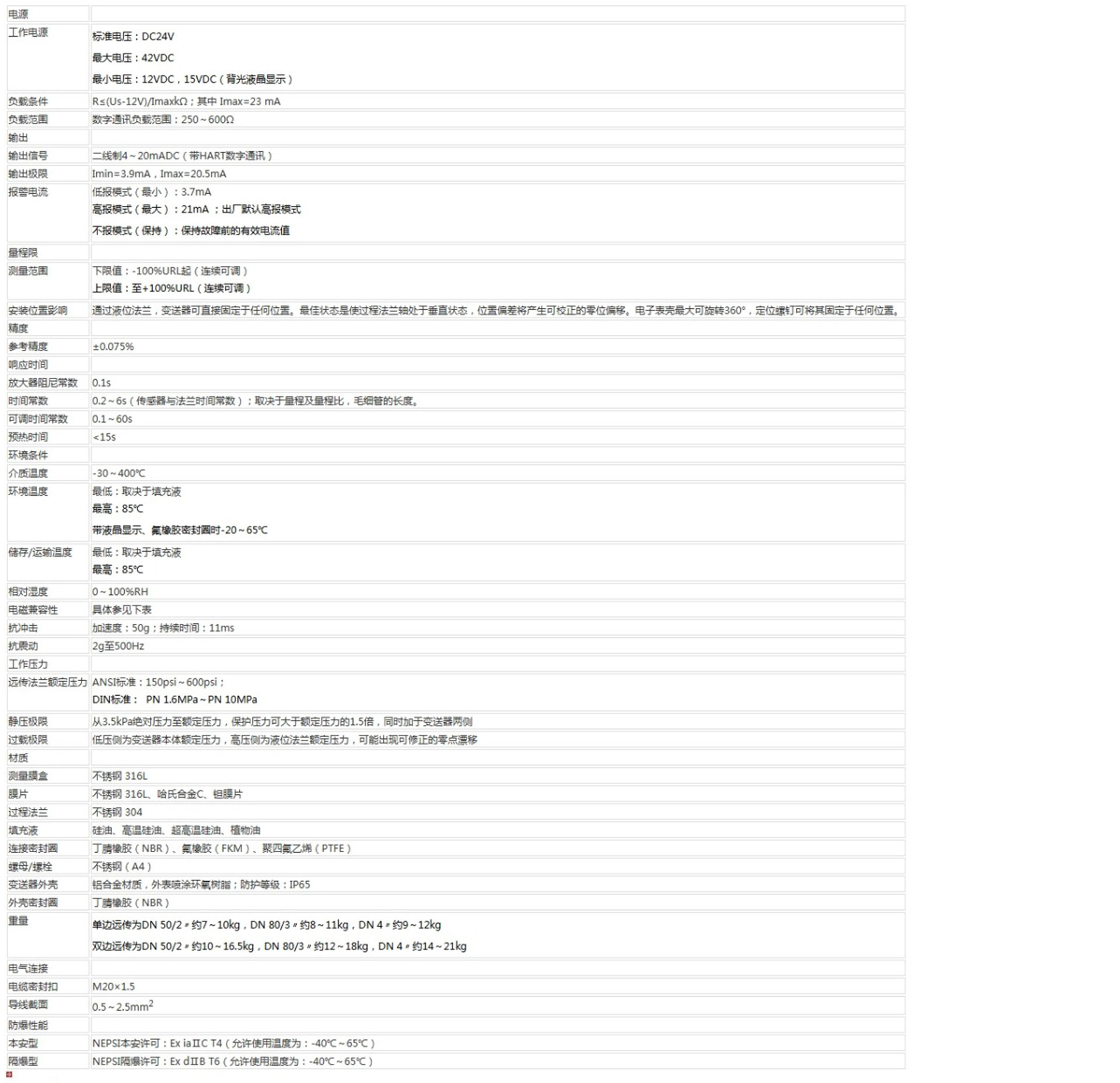 該產品用于測量液體、氣體或蒸汽的液位、密度、壓力,將其轉變成4~20mA (HART)電流輸出信號,可通過RST375手持終端對它們進行參數(shù)設定、過程監(jiān)控等。測量范圍(未遷移時)為0-1kPa~2MPa,液位法蘭的額定壓力分別為:1.6/4MPa、6.4MPa、10MPa、150psi、300psi或600psi。