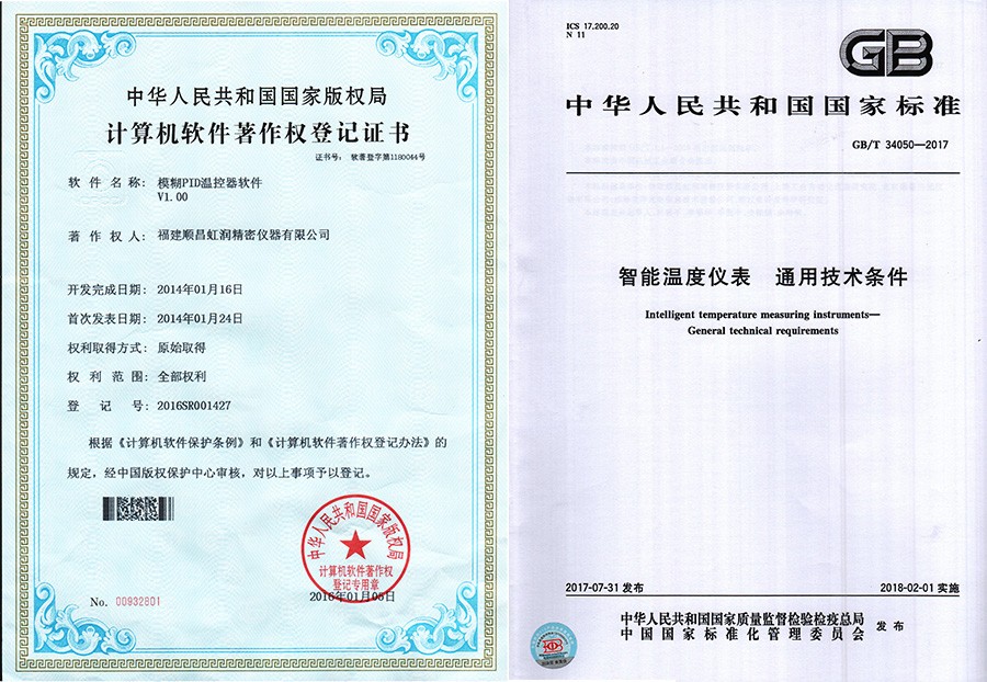 虹潤(rùn)公司模糊PID溫控器是虹潤(rùn)公司應(yīng)用自主知識(shí)產(chǎn)權(quán)開(kāi)發(fā)的新一代智能控制儀表,產(chǎn)品榮獲模糊PID控制儀及控制方法(專利號(hào)2015109378814)、一種智能化控制器及自整定方法(2016103155465)2項(xiàng)國(guó)家發(fā)明專利,傻瓜式模糊PID調(diào)節(jié)儀軟件V1.00(版權(quán)登記號(hào)2015SR171602)、模糊PID溫控器軟件V1.00(版權(quán)登記號(hào)2016SR001427)2項(xiàng)軟件著作權(quán),主持起草《智能溫度儀表 通用技術(shù)條件 GB/T 34050-2017》《工業(yè)過(guò)程控制系統(tǒng)用模擬輸入兩位或多位輸出儀表第2部分:檢查和例行試驗(yàn)導(dǎo)則》2項(xiàng)國(guó)家標(biāo)準(zhǔn)。其中《工業(yè)過(guò)程控制系統(tǒng)用模擬輸入兩位或多位輸出儀表第2部分:檢查和例行試驗(yàn)導(dǎo)則》標(biāo)準(zhǔn)正在起草中。