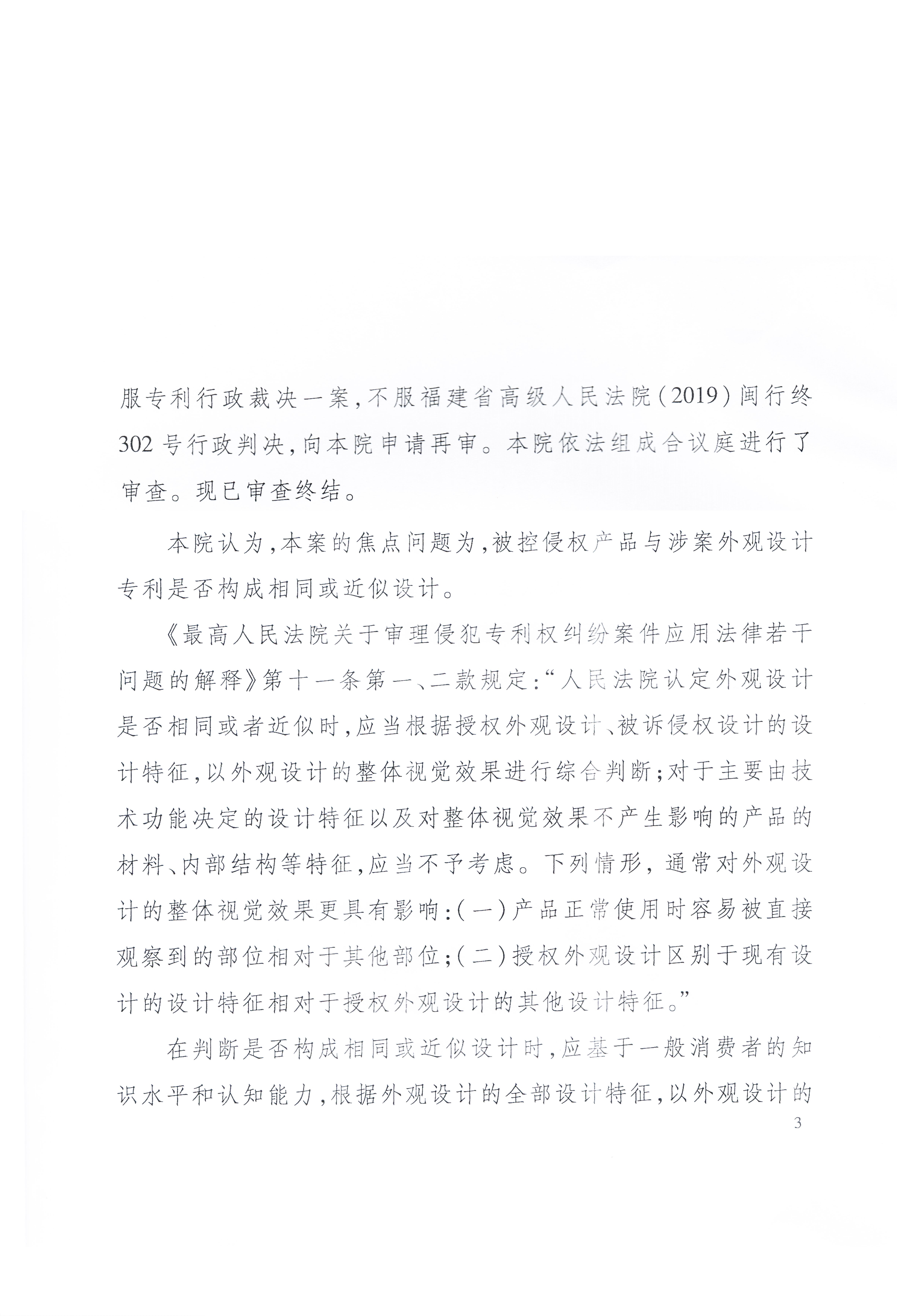 虹潤公司與廈門希科自動化科技有限公司、廈門市市場監(jiān)督管理局的專利行政裁決糾紛案【(2020)最高法行申516號】”入選最高人民法院2020年知識產(chǎn)權(quán)55件典型案件之第33例。最高人民法院針對本案指出“侵害外觀設(shè)計專利權(quán)案件中,不同產(chǎn)品的消費群體可能會有所差異,故對于一般消費者的范圍,應(yīng)結(jié)合產(chǎn)品的實際購買、使用等情況具體確定。”該審理思路對類似案件的法律適用問題具有重要的指導(dǎo)意義。