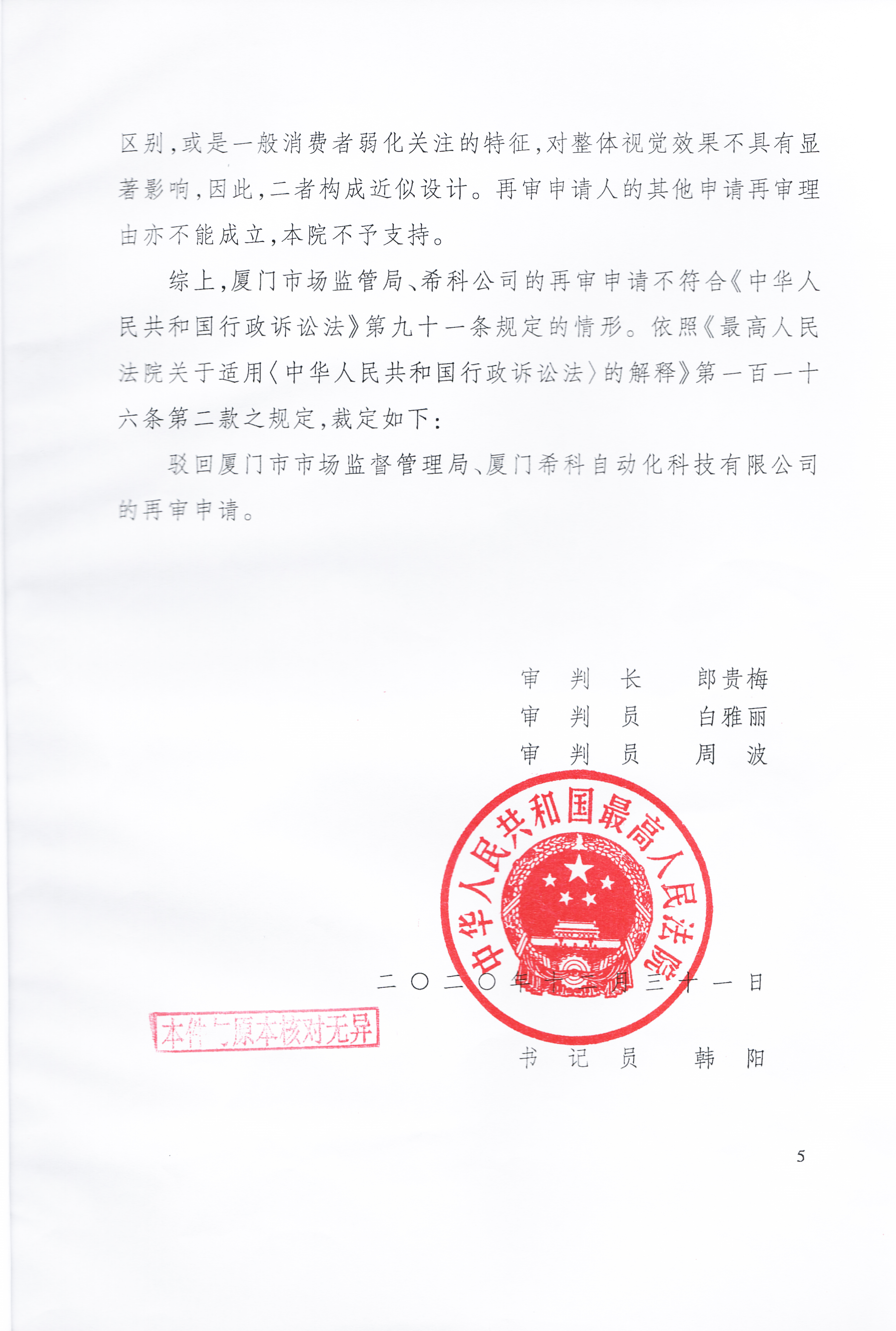 該案于2019年7月30日由福建省高級人民法院終審判定廈門??乒厩址负鐫櫣緦@麢?quán)。??乒静环?019年10月31日又向最高人民法院提出再審,最高人民法院在經(jīng)過長期的嚴(yán)格調(diào)查審理后,于近期最終判定廈門希科公司侵權(quán)并駁回其上訴請求。