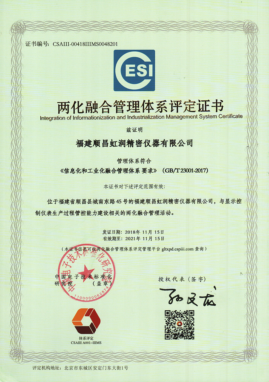 近年來,虹潤公司積極響應國家號召,堅持走“專業(yè)化、精細化、特色化、新穎化”的專精特新發(fā)展道路,邁出了可喜的步伐。公司是國家高新技術企業(yè)、國家級知識產權優(yōu)勢企業(yè)、福建省戰(zhàn)略性新興產業(yè)骨干企業(yè)、福建省科技小巨人領軍企業(yè),和上海理工大學莊松林院士合作建立了院士專家工作站,擁有500多項國家專利及100多項軟件著作權。主持或參與制定了56項國家標準,嚴格按照ISO9001標準建立了質量管理體系,“虹潤”商標被國家工商局認定為“中國馳名商標”。獲得工信部兩化融合管理體系認證、歐盟CE認證,國際SIL功能安全認證,國家防爆證。公司先后研發(fā)出了數顯表與溫控器、無紙記錄儀、隔離器與安全柵、溫度變送器、壓力變送器、電量表與變送器、電能質量分析儀、過程校驗儀、可編程控制器、環(huán)境監(jiān)測儀表等十大系列高新技術產品,為用戶提供了技術含量高、品質一流的優(yōu)質產品和服務,受到了用戶的廣泛贊譽。