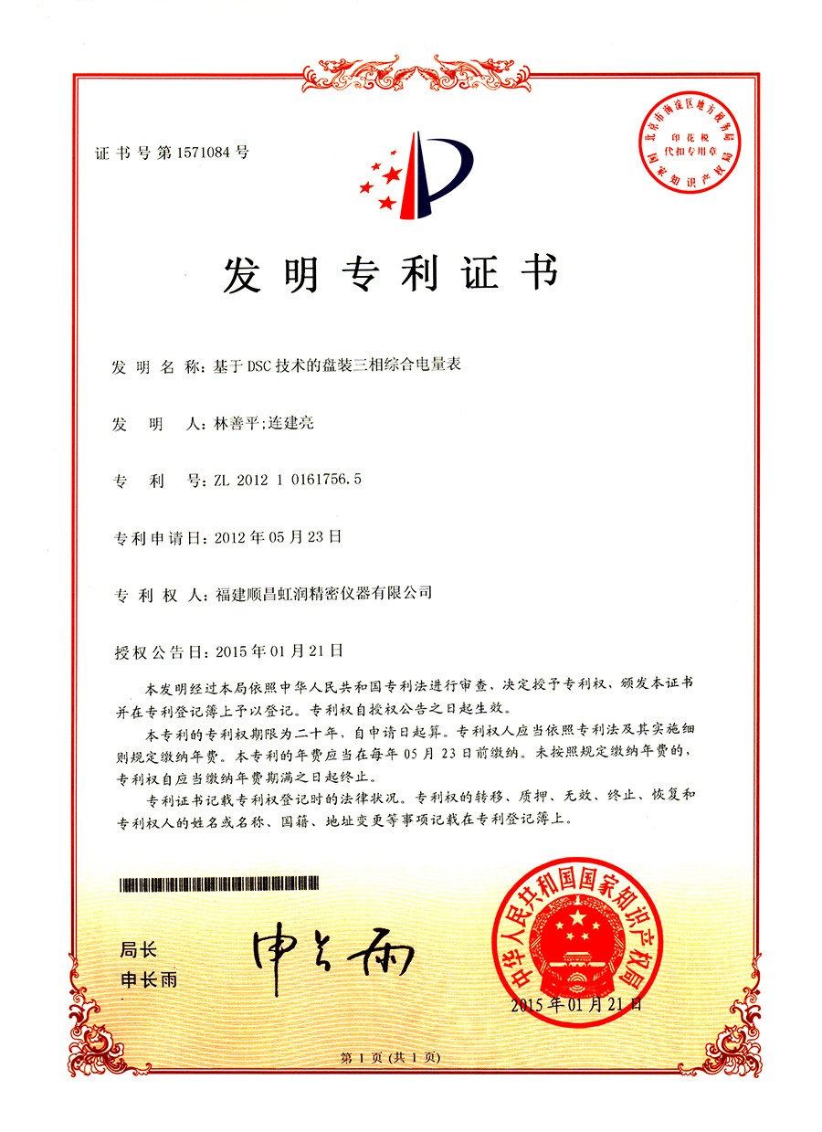 基于DSC技術(shù)的盤裝三相綜合電量表 發(fā)明專利證書 |
