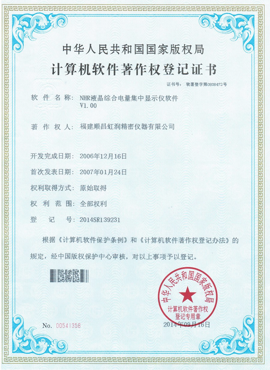 液晶綜合電量集中顯示儀 軟件登記證書 |