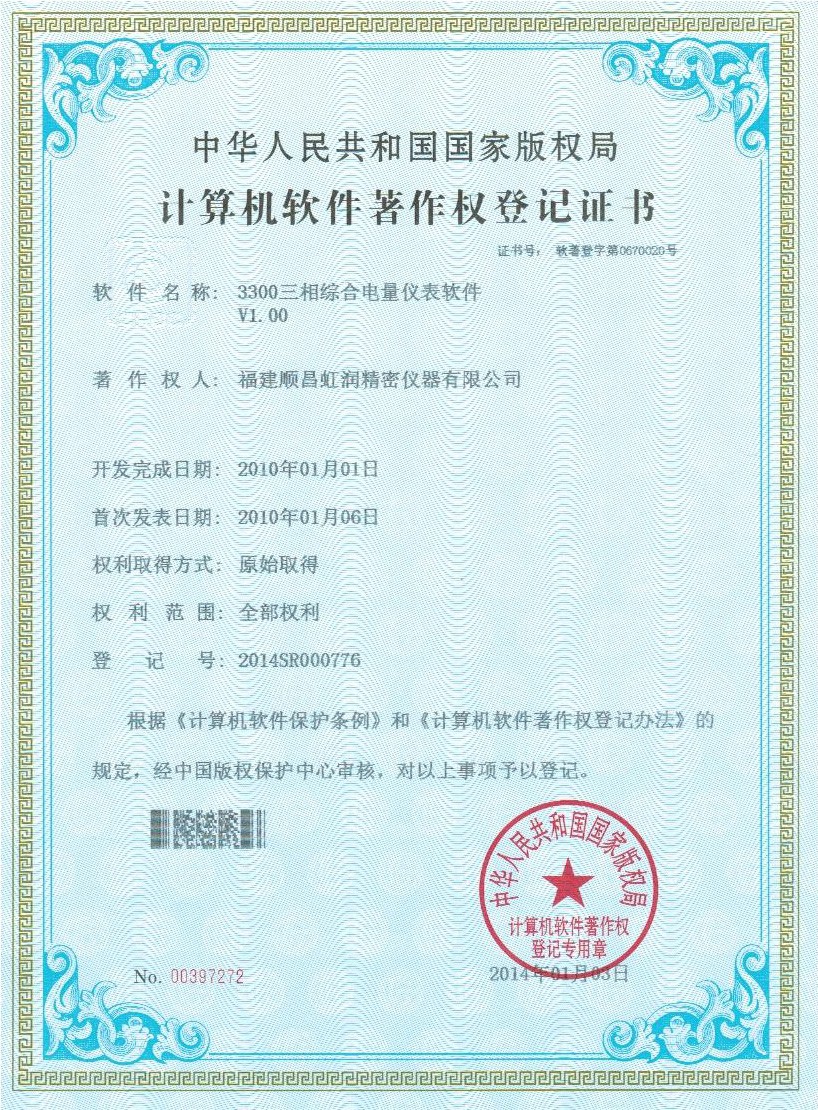 3300三相綜合電量?jī)x表 軟件登記證書 |