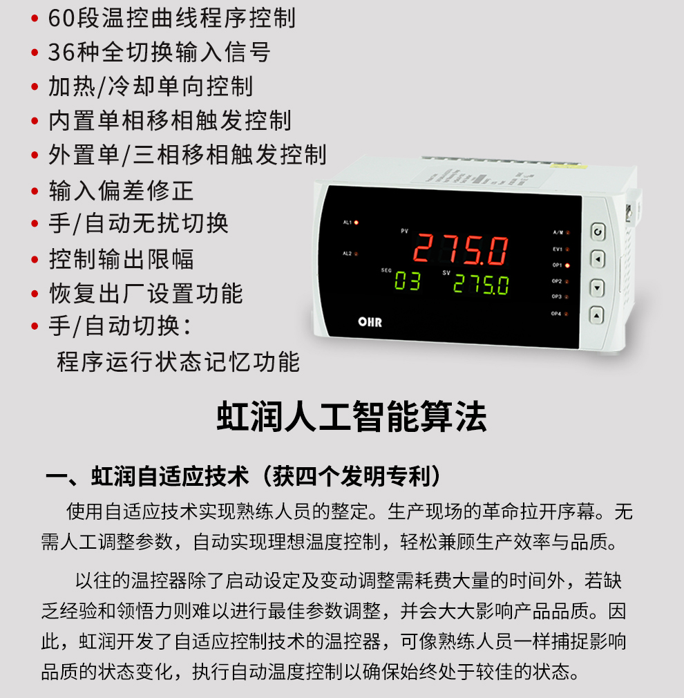 OHR-E400系列60段人工智能溫控器采用真正的人工智能算式,儀表啟動(dòng)自整定功能,可以根據(jù)被控對(duì)象的特性,自動(dòng)尋找參數(shù)以達(dá)到很好的控制效果,無(wú)需人工整定參數(shù)??販鼐然具_(dá)±0.1℃,無(wú)超調(diào)、欠調(diào),達(dá)國(guó)際先進(jìn)水平。