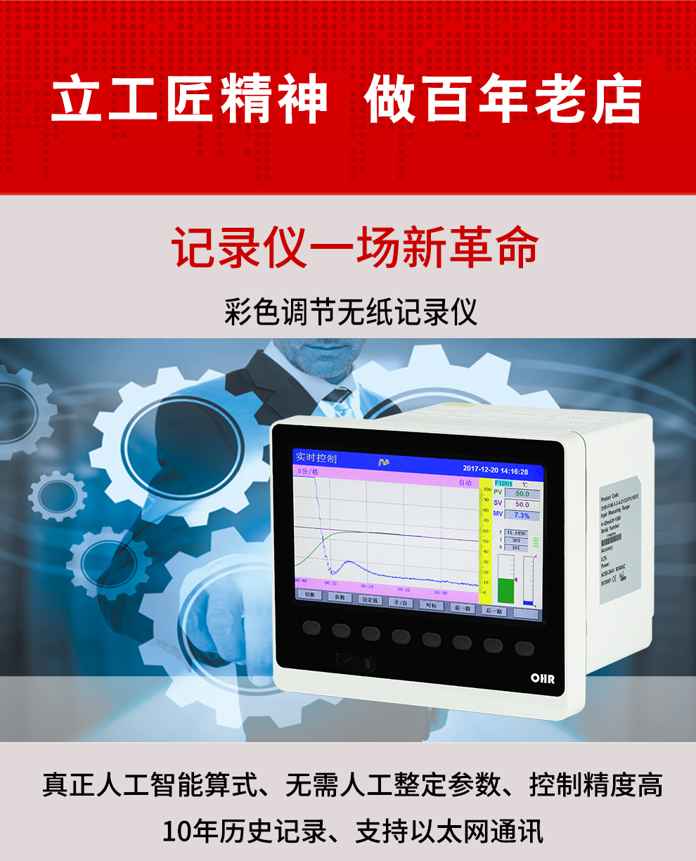 OHR-H300系列彩色調(diào)節(jié)無紙記錄儀采用真正的人工智能算式,儀表啟動(dòng)自整定功能,可根據(jù)被控對(duì)象的特性,自動(dòng)尋找最優(yōu)參數(shù)以達(dá)到很好的控制效果,無需人工整定參數(shù)。控溫精度基本達(dá)±0.1℃,無超調(diào)、欠調(diào),達(dá)國(guó)際先進(jìn)水平。24路萬能輸入(可組態(tài)選擇輸入:標(biāo)準(zhǔn)電壓、標(biāo)準(zhǔn)電流、熱電偶、熱電阻、毫伏等)其中可帶8路控制輸入。