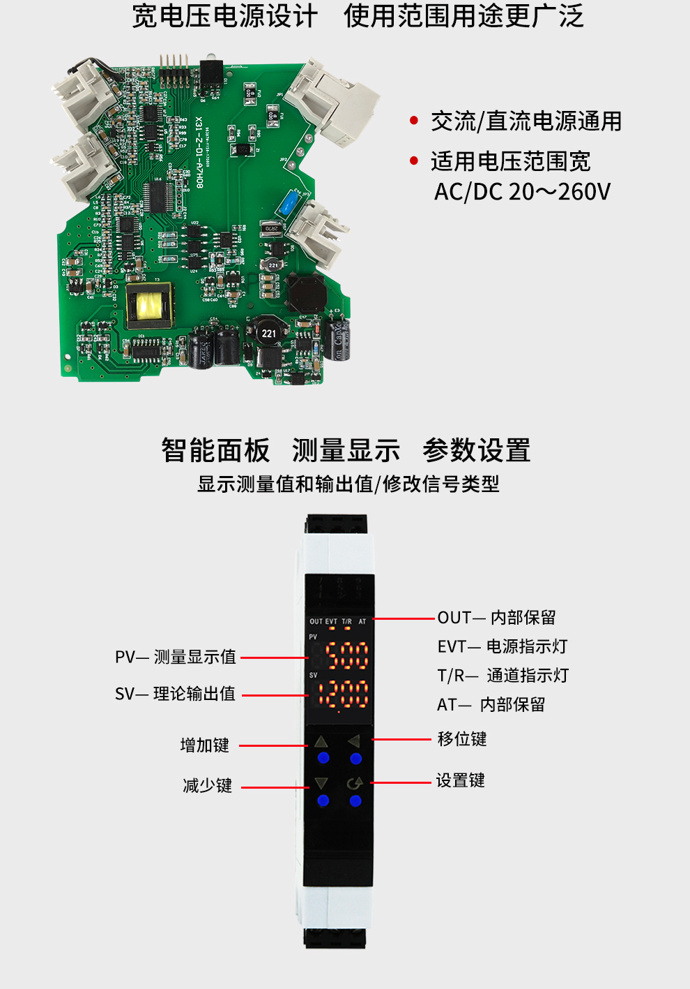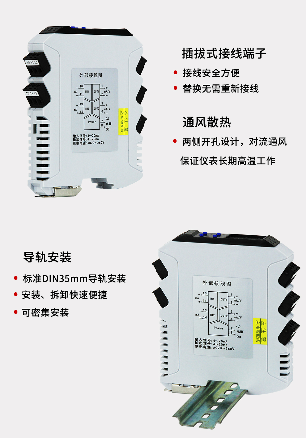 OHR-X31系列導軌式智能隔離器將現(xiàn)場的直流電壓或電流信號經過隔離傳送,轉換成所需的信號給其它儀表??梢耘cDCS、PLC等系統(tǒng)配套使用,從而提高工業(yè)生產過程自動控制系統(tǒng)的抗干擾能力,保證系統(tǒng)的穩(wěn)定性和可靠性。寬電源設計:20-260V交直流供電。配置高清顯示單元,通過輕觸按鍵設置每個通道的參數及通道之間的切換。