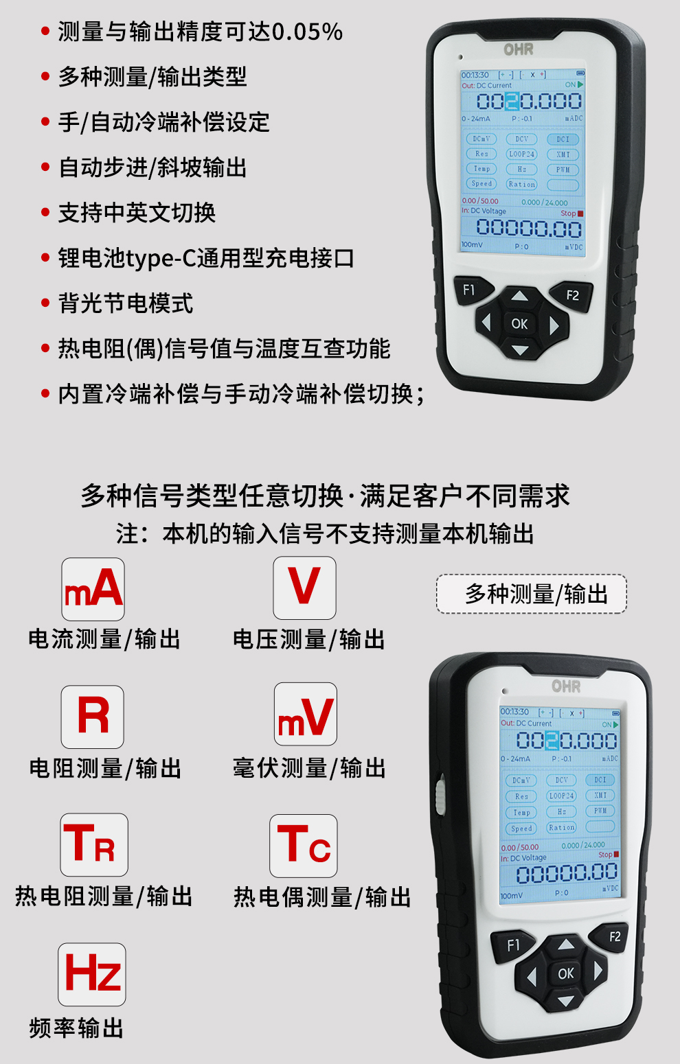 OHR-D00經(jīng)濟(jì)型過(guò)程校驗(yàn)儀是帶測(cè)量與輸出的過(guò)程信號(hào)校驗(yàn)儀。產(chǎn)品具 有高精度、信號(hào)任意切換、續(xù)航能力強(qiáng)、大彩屏占比、小巧便攜等特點(diǎn), 產(chǎn)品功能設(shè)置簡(jiǎn)單易用,為使用者帶來(lái)了更便捷的體驗(yàn)。