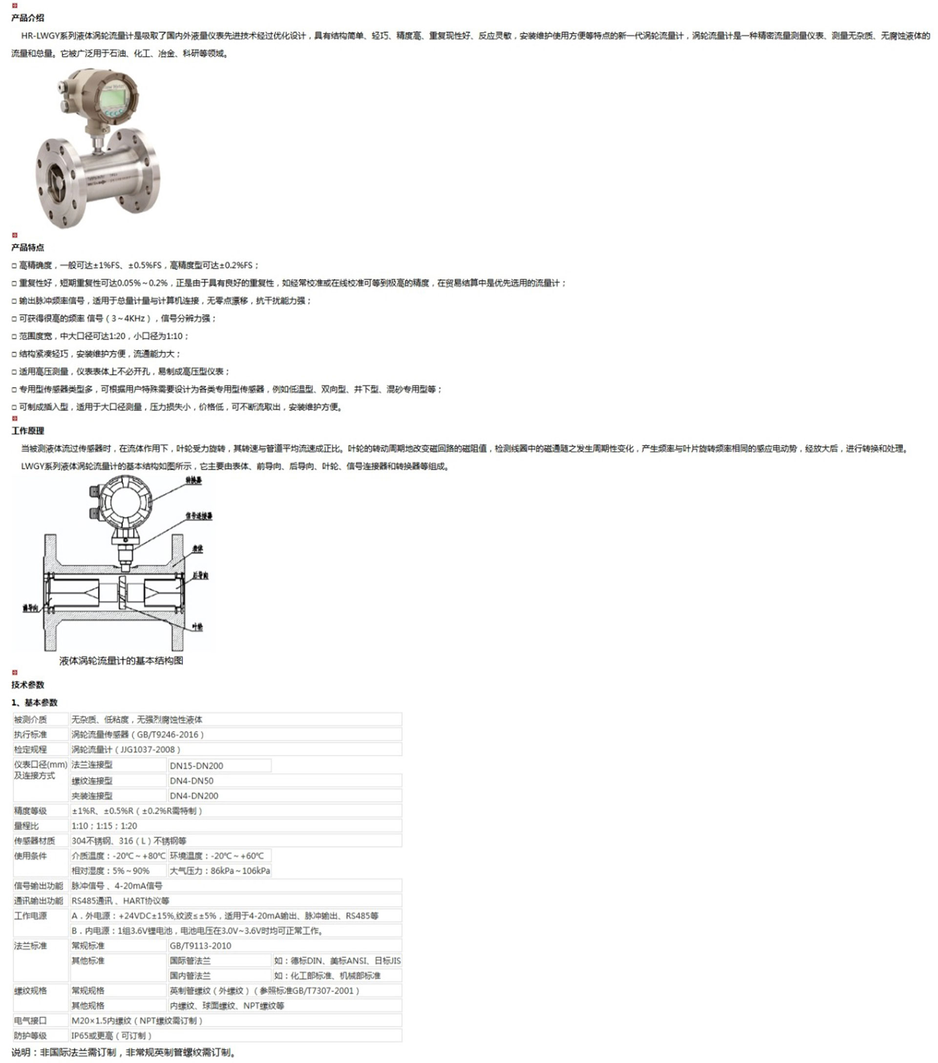 HR-LWGY系列液體渦輪流量計(jì)是吸取了國內(nèi)外液量儀表先進(jìn)技術(shù)經(jīng)過優(yōu)化設(shè)計(jì),具有結(jié)構(gòu)簡單、輕巧、精度高、重復(fù)現(xiàn)性好、反應(yīng)靈敏,安裝維護(hù)使用方便等特點(diǎn)的新一代渦輪流量計(jì),渦輪流量計(jì)是一種精密流量測量儀表、測量無雜質(zhì)、無腐蝕液體的流量和總量。它被廣泛用于石油、化工、冶金、科研等領(lǐng)域。