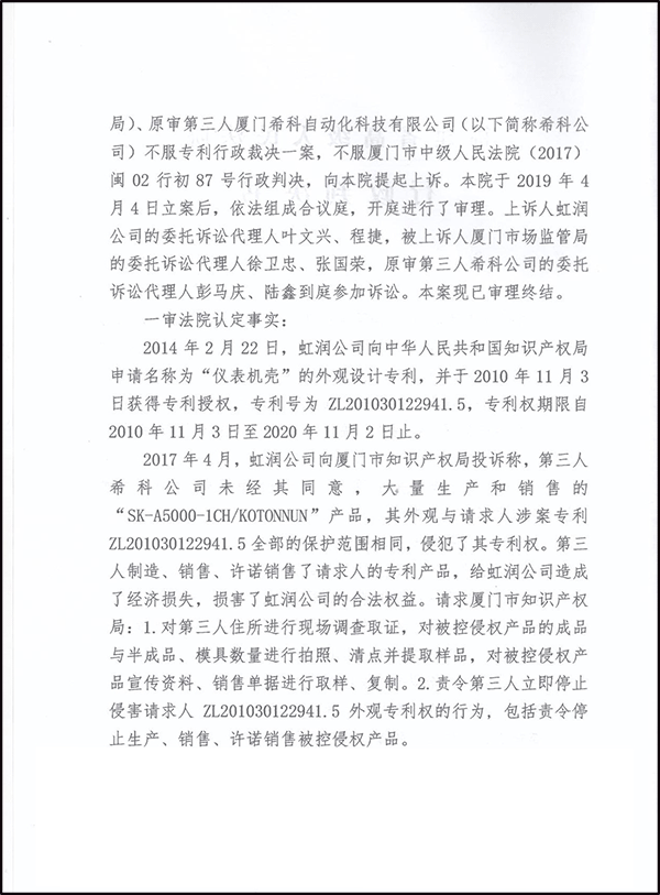 2015年9月福建順昌虹潤(rùn)精密儀器有限公司(以下簡(jiǎn)稱虹潤(rùn)公司)在市場(chǎng)上發(fā)現(xiàn)廈門??谱詣?dòng)化科技有限公司(以下簡(jiǎn)稱??乒荆┪唇?jīng)虹潤(rùn)公司同意,大量生產(chǎn)和銷售仿冒虹潤(rùn)NHR-8000系列無(wú)紙記錄儀的侵權(quán)產(chǎn)品??艫5000、A6000無(wú)紙記錄儀。侵犯了虹潤(rùn)公司的知識(shí)產(chǎn)權(quán)。虹潤(rùn)公司于2016年先發(fā)函告知??乒局兄骨謾?quán)行為,但??乒静挥枥頃?huì)。為了維護(hù)自身的合法權(quán)益,虹潤(rùn)公司又向廈門市市場(chǎng)監(jiān)督管理局(原廈門市知識(shí)產(chǎn)權(quán)局)申請(qǐng)行政處理,后再提起行政訴訟。2019年7月30日,福建省高級(jí)人民法院作出【2019】閩行終302號(hào)行政判決書(shū),認(rèn)定??乒旧a(chǎn)的產(chǎn)品與我司的“儀表機(jī)殼”外觀設(shè)計(jì)專利整體形狀、正面面板設(shè)計(jì)上基本相同。至此,虹潤(rùn)公司歷時(shí)四年的維權(quán)行為得到了法律支持,福建省高院終審認(rèn)定廈門希科無(wú)紙記錄儀專利侵權(quán)。